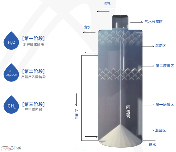 在厌氧塔内的厌氧菌作用下可以去除废水中一部分COD、 氨氮、色度,并将难降解的大分子有机物打断为可生化性 好的小分子有机物,其中包括很难去除的活性染料部分,提高后续好氧生化系统的去除效率。
